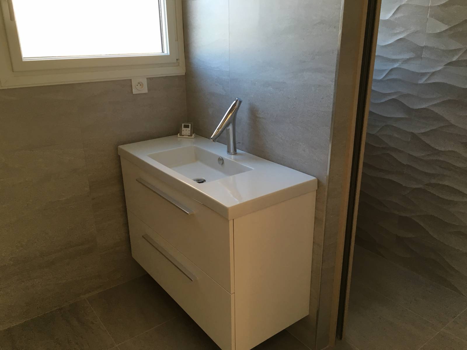 Nous pouvons jouer sur les effets de peinture pour donner du volume à un mur, une pose de carrelage haut-de-gamme pour donner du cachet à votre sol, encastrer le miroir et le surplomber de Leds pour un résultat tendance.