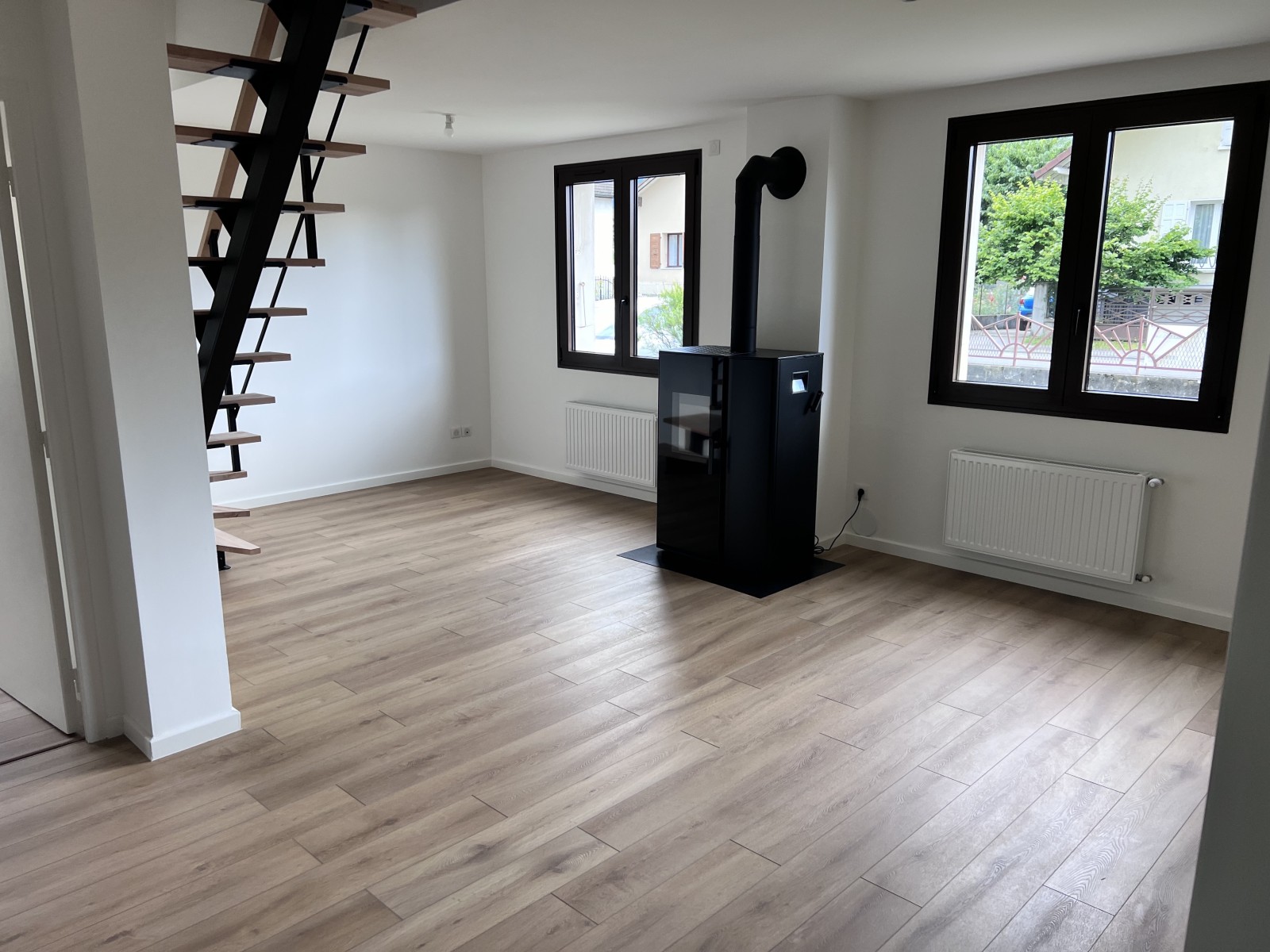 Enfin, en menuiserie extérieure, des fenêtres bois double vitrage sur mesure (dimensions 1440x2550 mm et 700x1200 mm) ont été intégrées, assurant performance thermique et esthétique.