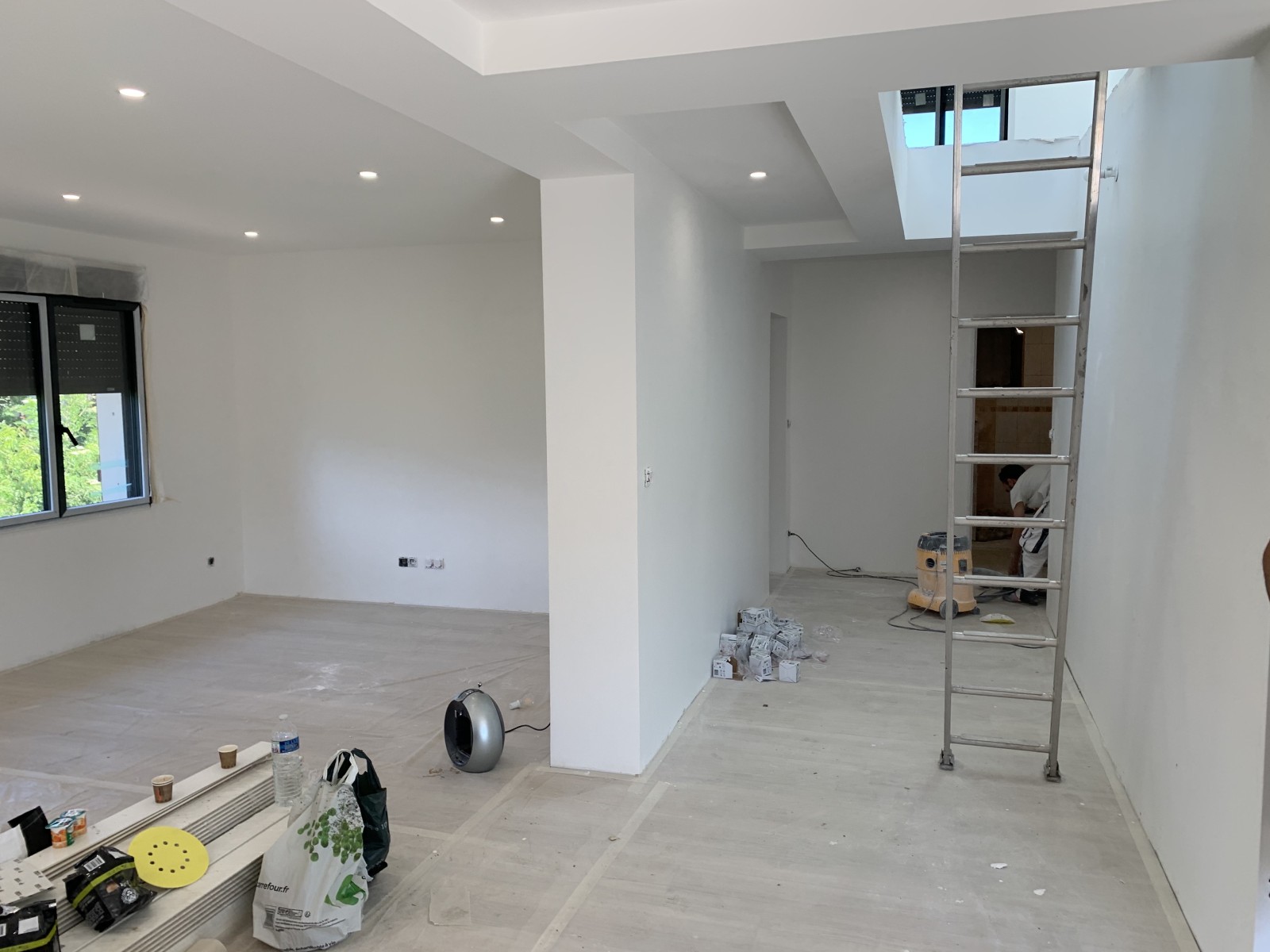 Cette rénovation complète a nécessité des choix techniques rigoureux : installation d’IPN métalliques pour l’ouverture de murs porteurs, escalier en hêtre quart tournant, doublages en Optima avec laine de verre GR 32, plafond Placostil® en Placoflam®... Nos équipes ont également coordonné les reprises d'altimétrie, trémies, et toutes les adaptations nécessaires à un chantier dense et technique.