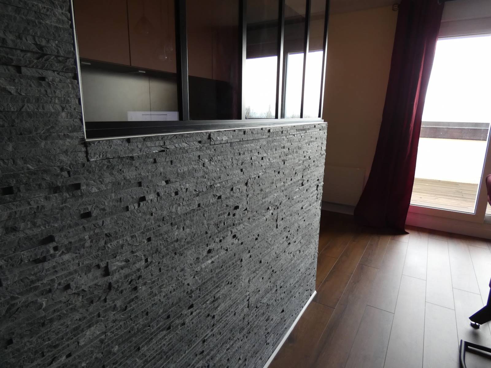 Une pose de parement en pierre naturelle a été posée côté salon et un soubassement en placoplâtre a été réalisé côté cuisine.