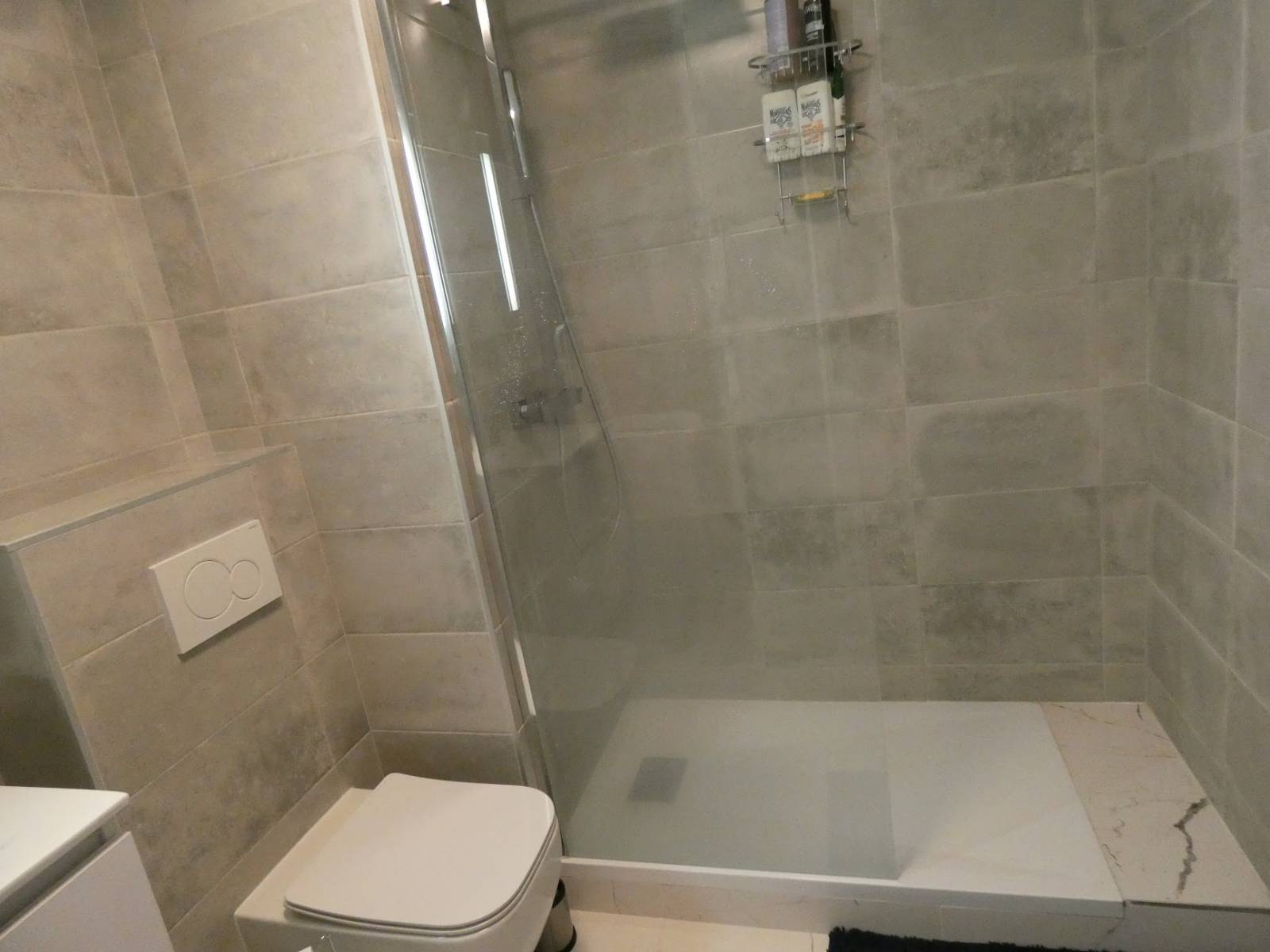 Notre client, situé dans le Pays De Gex proche de la frontière suisse, a choisi de carreler entièrement sa salle de bain avec de la faïence grise/beige.