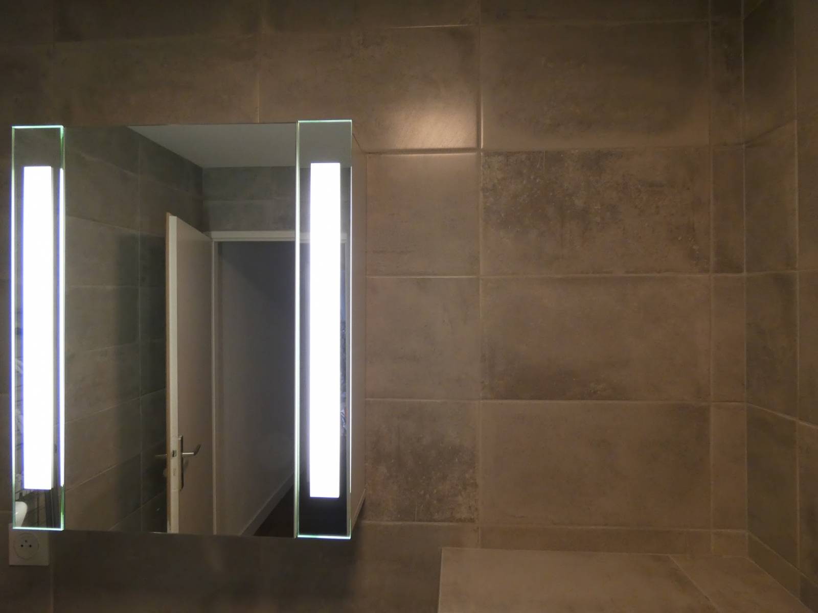 Pour les sanitaires, un WC suspendu Geberit a été installé, une robinetterie Hansgroe a été choisie par notre client, un miroir incrusté de deux panneaux LED a été posé et donne ainsi cette touche de modernité essentielle pour cet appartement.