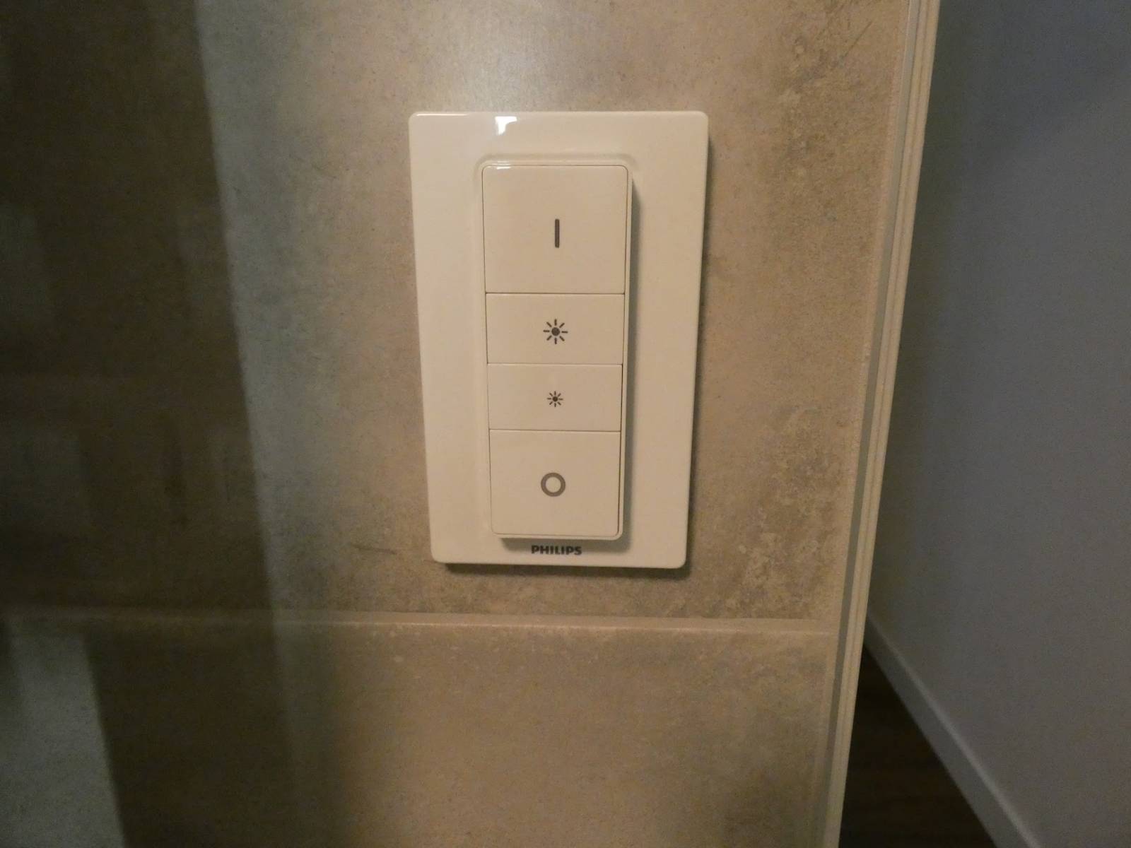 Enfin, les électriciens ont installé l’alimentation des volets roulants, l’alimentation des radiateur, le changement d’appareillage dans tout l’appartement, et des télécommandes de variation de luminosité fixées sur le mur.