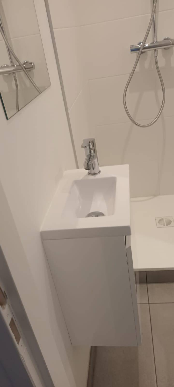 L'équipe de notre entreprise de rénovation générale à Lyon, a également repris les raccordements et évacuations de tous les réseaux de plomberie du studio à Oullins. Et pour assurer une transformation complète de la salle de bain, les travaux ont aussi inclus l'installation de nouveaux WC, d'un receveur de douche, d'une colonne de douche et d’un meuble avec lavabo.