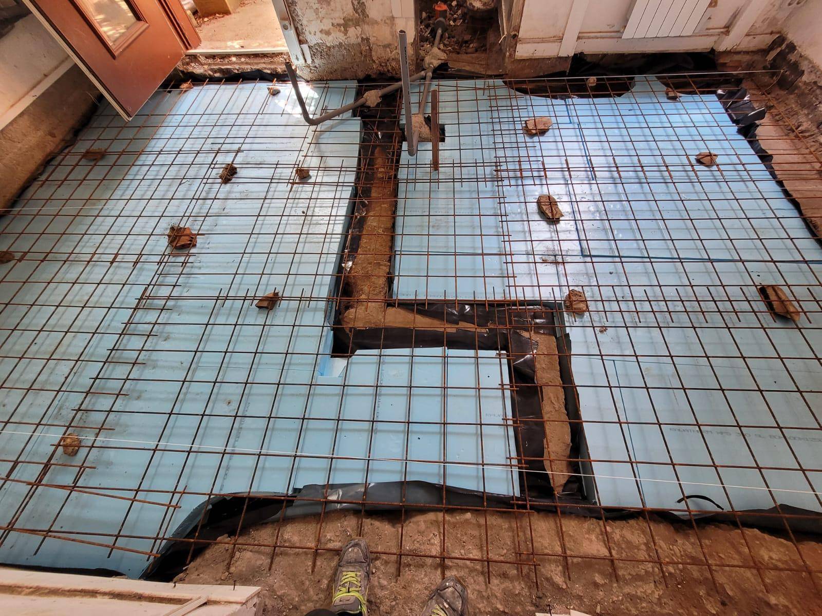 La rénovation du sol a nécessité d'importants travaux d'isolation et de maçonnerie. Avant de réaliser le ragréage de la chape de ciment, nos artisans ont posé une sous-couche en polystyrène extrudé sous le dallage en béton armé. Les sols ont ensuite été recouverts d'un carrelage en grès cérame 60 x 60. Pour assurer un confort optimal et minimiser les déperditions thermiques, nous avons installé une ventilation mécanique contrôlée (VMC), nécessitant la création d'un faux plafond.