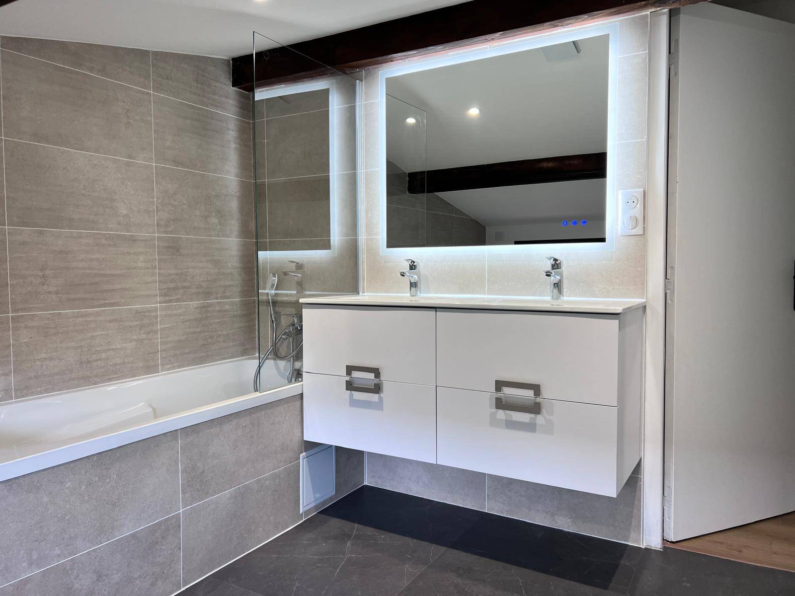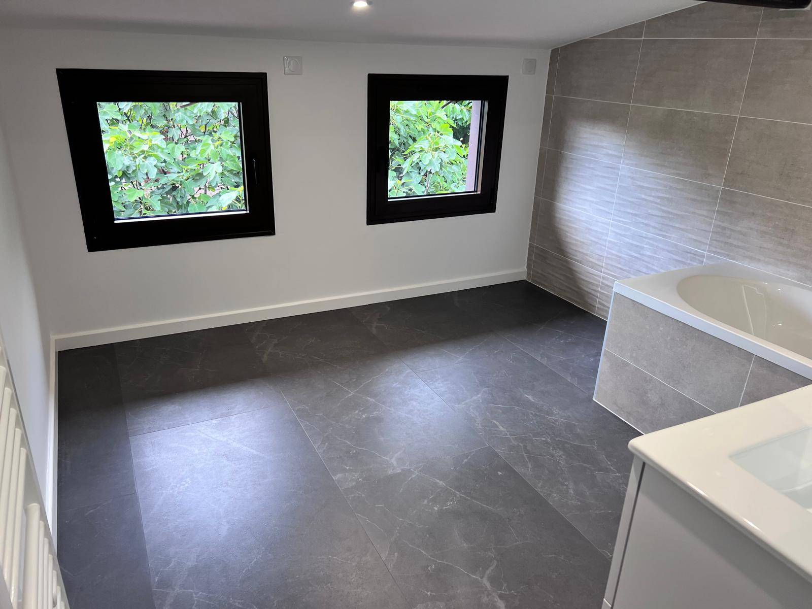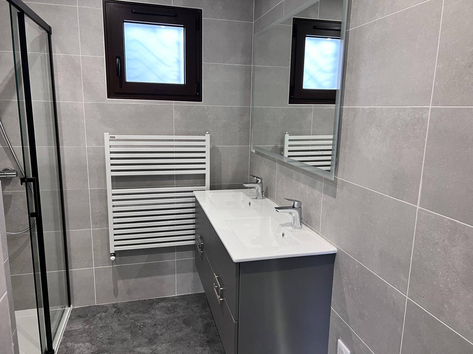 Deux salles d’eau ont été créées avec la pose d’une baignoire, d’un pare baignoire, meuble de salle de bain, la pose d’un receveur de douche 120X80 avec une porte de douche coulissante et un meuble de salle de bain.