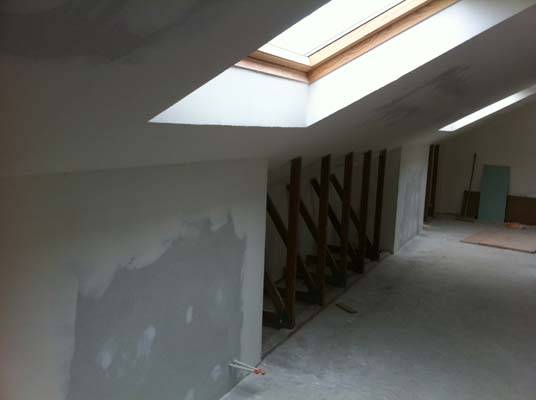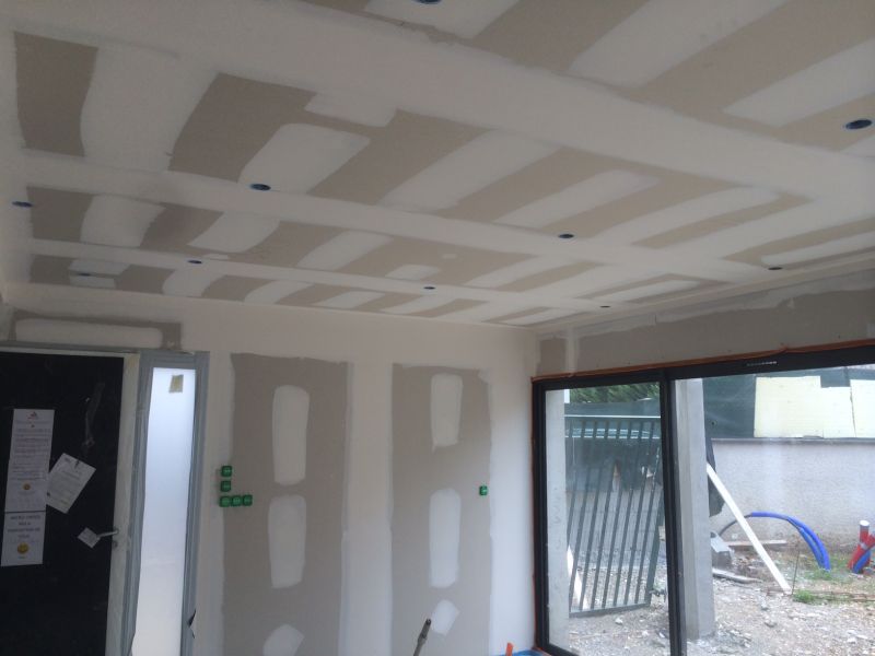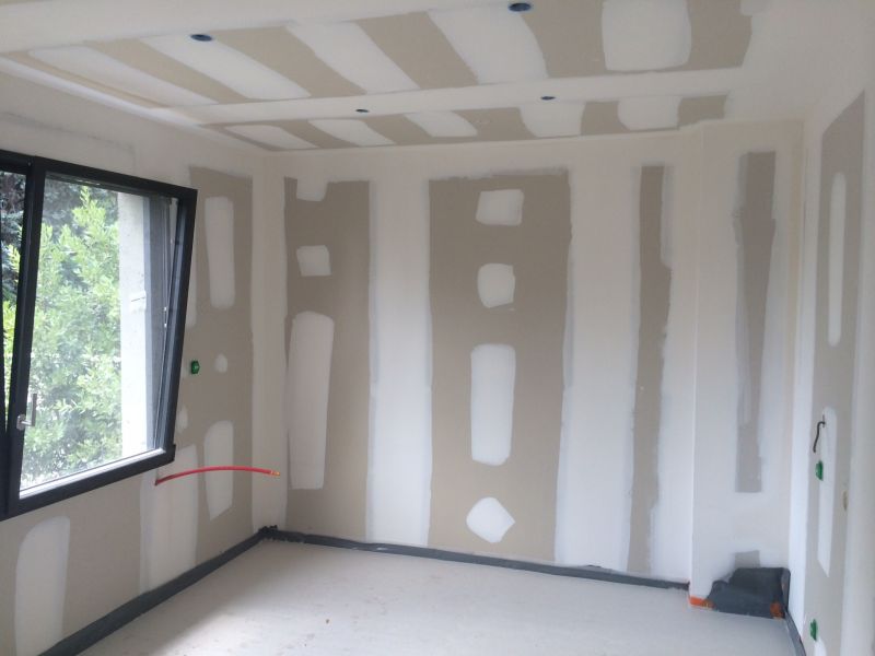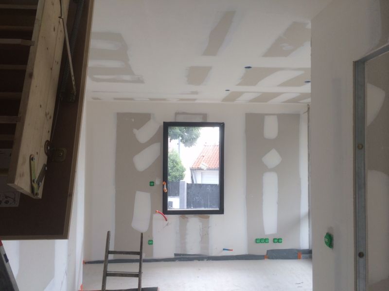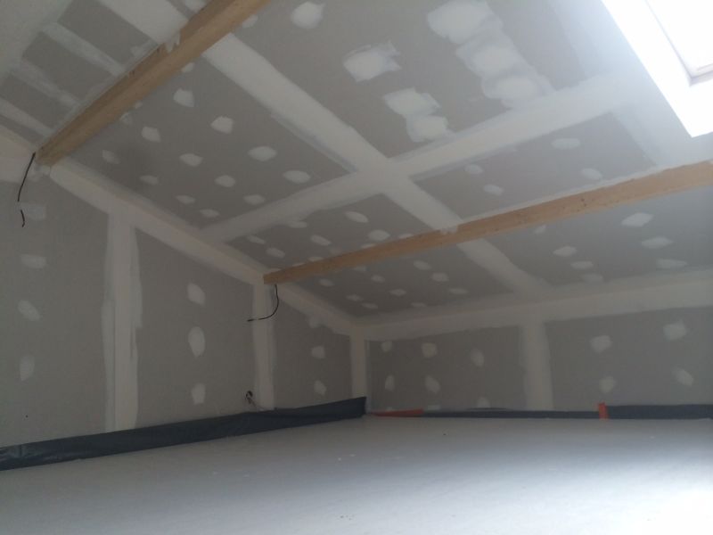 Nous avons créé les joints des plaques de plâtre afin d'avoir une surface lisse parfaite avant la mise en peinture des murs et des plafonds.